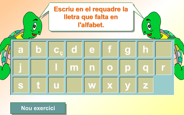 Aplicació que genera exercicis per memoritzar l’alfabet, sense so.