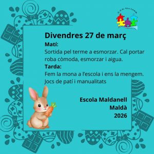 Farem una sortida pel terme durant el matí i esmorzarem entre natura, flors i sol. A la tarda farcirem la mona i ens la menjarem, també jugarem i ens emportarem les manualitats de Pasqua.