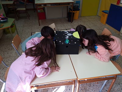 Hem pogut observar les 4 fases lunars mirant pels diferents “telescopis” (foradets) de la “Capsa lunar”. El Sol estava representat amb una llanterna fixa i la posició de la Terra la representàvem nosaltres. Hem observat la Lluna Plena, la Lluna Nova (quan és fosca), la Lluna Creixent i la Lluna Minvant (quan té forma de “C”)