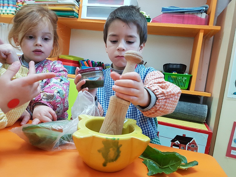 El Marcel ens ha portat un pot preparat amb aigua de colors verda que ha fet xafant espinacs dins un morter.