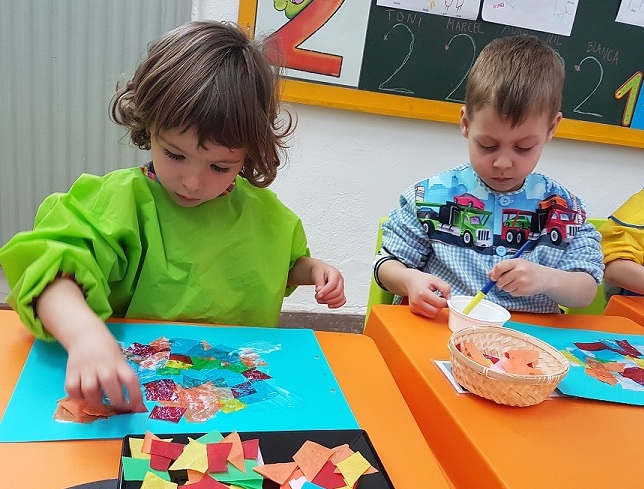 Enganxem papers de seda de colors amb vernís, cadascú crea el seu mosaic i després punxarem una papallona i farem la tapa de l’àlbum del trimestre.