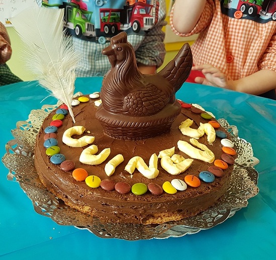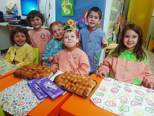 L’últim dia del trimestre hem fet la Mona. Hem posat melmelada de préssec dins el pa de pessic. Per damunt l’hem recobert de xocolata i finalment ho hem decorat amb “Lacasitos”, una figura de xocolata i el nom de la nostra classe amb mantega. Fa molt bona pinta!