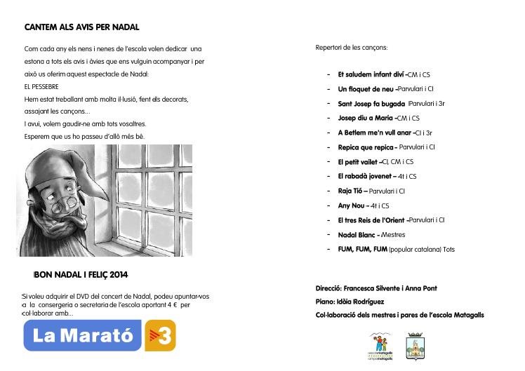 També us volem recordar que tots els avis i àvies de l’escola poden venir a gaudir del concert de nadal que ens oferiran els nens i nenes des de P-3 fins a 6è el proper dijous dia 19 de desembre a les 3 de la tarda.