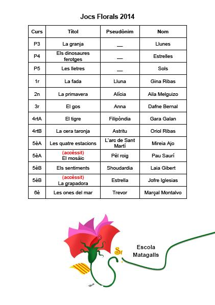 - Dimecres 30 d’abril, fem la cloenda dels JOCS FLORALS de l’escola. Els guanyadors d’enguany han estat:
