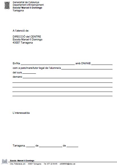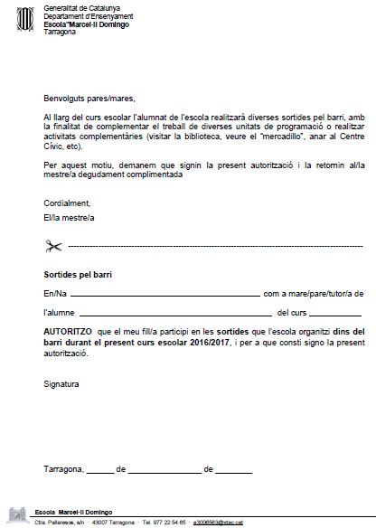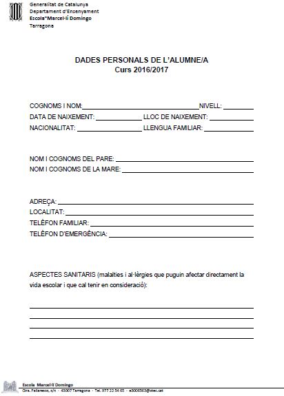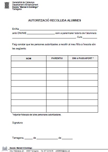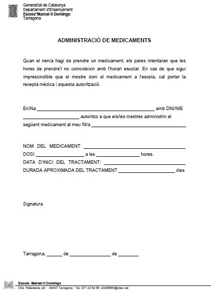 Documents de centre (autoritzacions) Carta de Compromís Sortides Recollida alumnes Dades personals Dret d’imatge Administració medicaments Sol·licitud demanda
