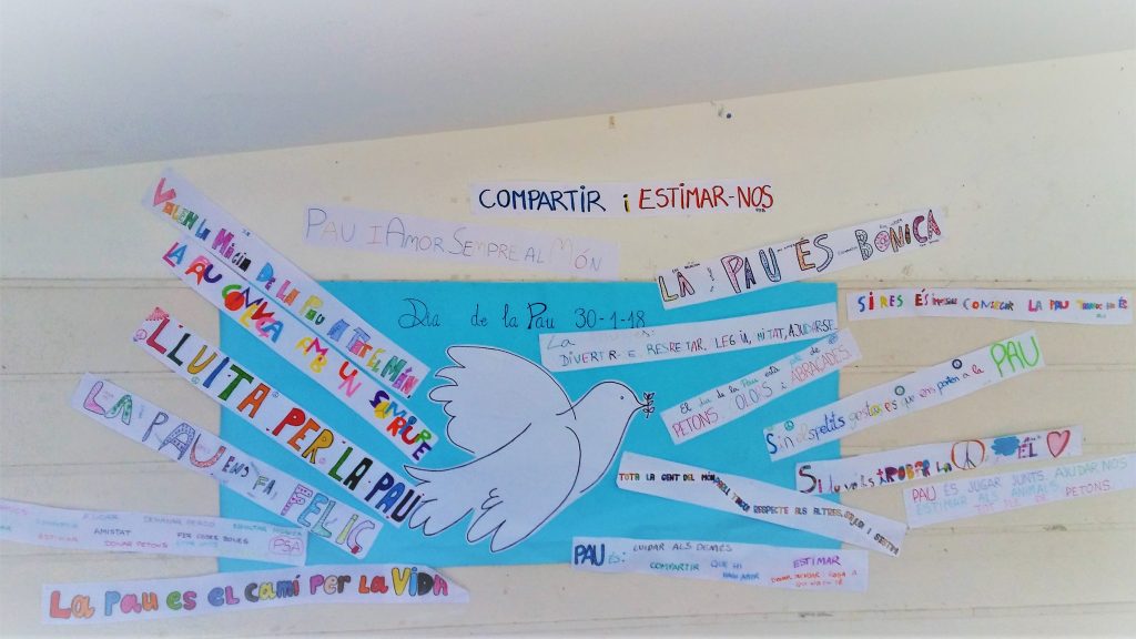 Aquest any cada classe ha escrit una frase entorn el tema de la pau i entre tots i totes hem fet un mural per exposar-les al voltant del colom, símbol de la pau.