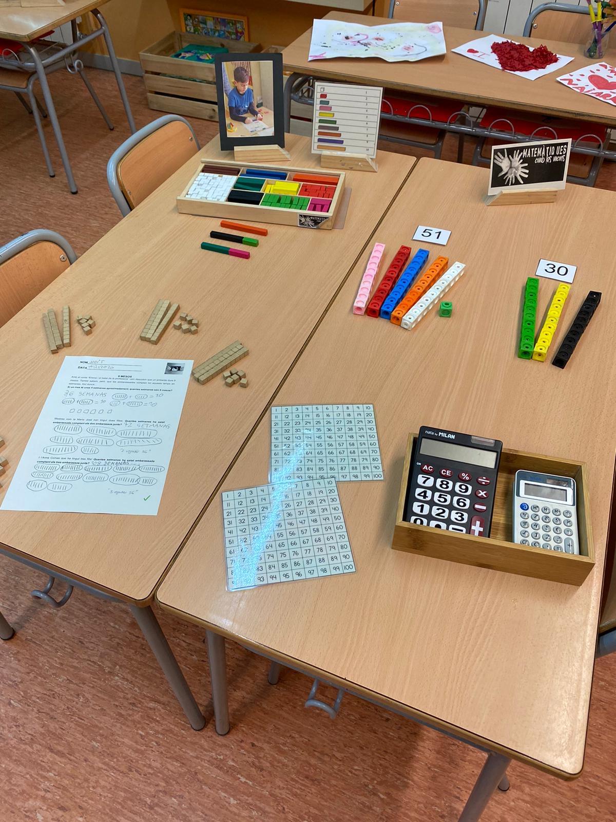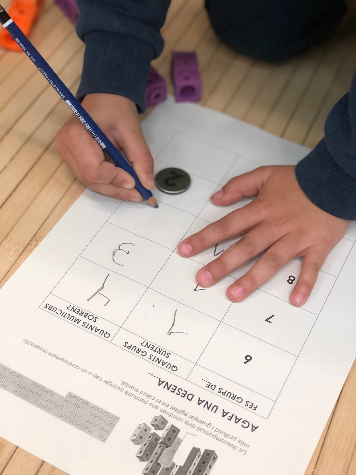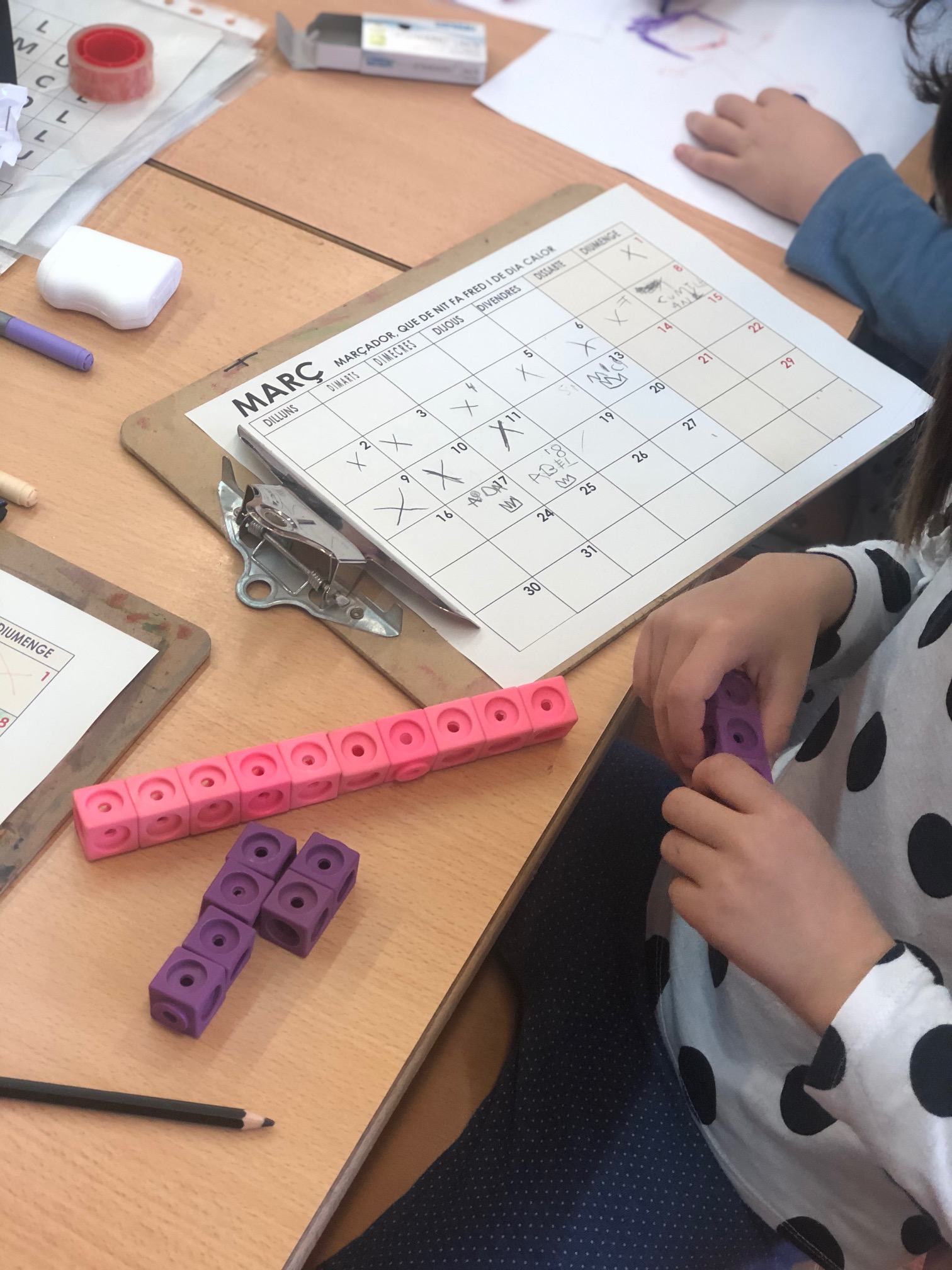 Setmanalment incorporem una sessió que anomenem matemàtiques amb les mans on creem uns espais de treball per potenciar l’aprenentatge de coneixements específics de numeració i càlcul, de lògica, de geometria o d’estadística.