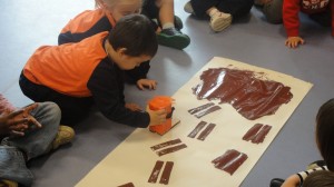 Cada dimarts tornant del pati dediquem una estona a fer diversos treballs orientats a millorar la destresa manual. Formem equips d’uns 8 o 9 nens/es i cada setmana passen per un racó de diferent. Al final de la roda cada grup haurà pogut esquinçar paper, enganxar gomets, experimentar amb el fang i la pissarra digital, fer traç amb pintura i pinzells, amb xocolota, a la sorra…