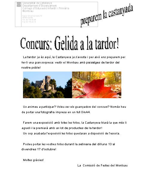 A la tarda baixarem al pati on ens vindrà a visitar la senyora castanyera acompanyada pels seus ajudants i repartiran les castanyes i sucs a tots els nens i nenes. També s’atorgarà el premi als alumnes guanyadors del concurs de fotografia “Gelida a la tardor”. Acabarem la festa amb una mica de gresca, cantant i ballant.