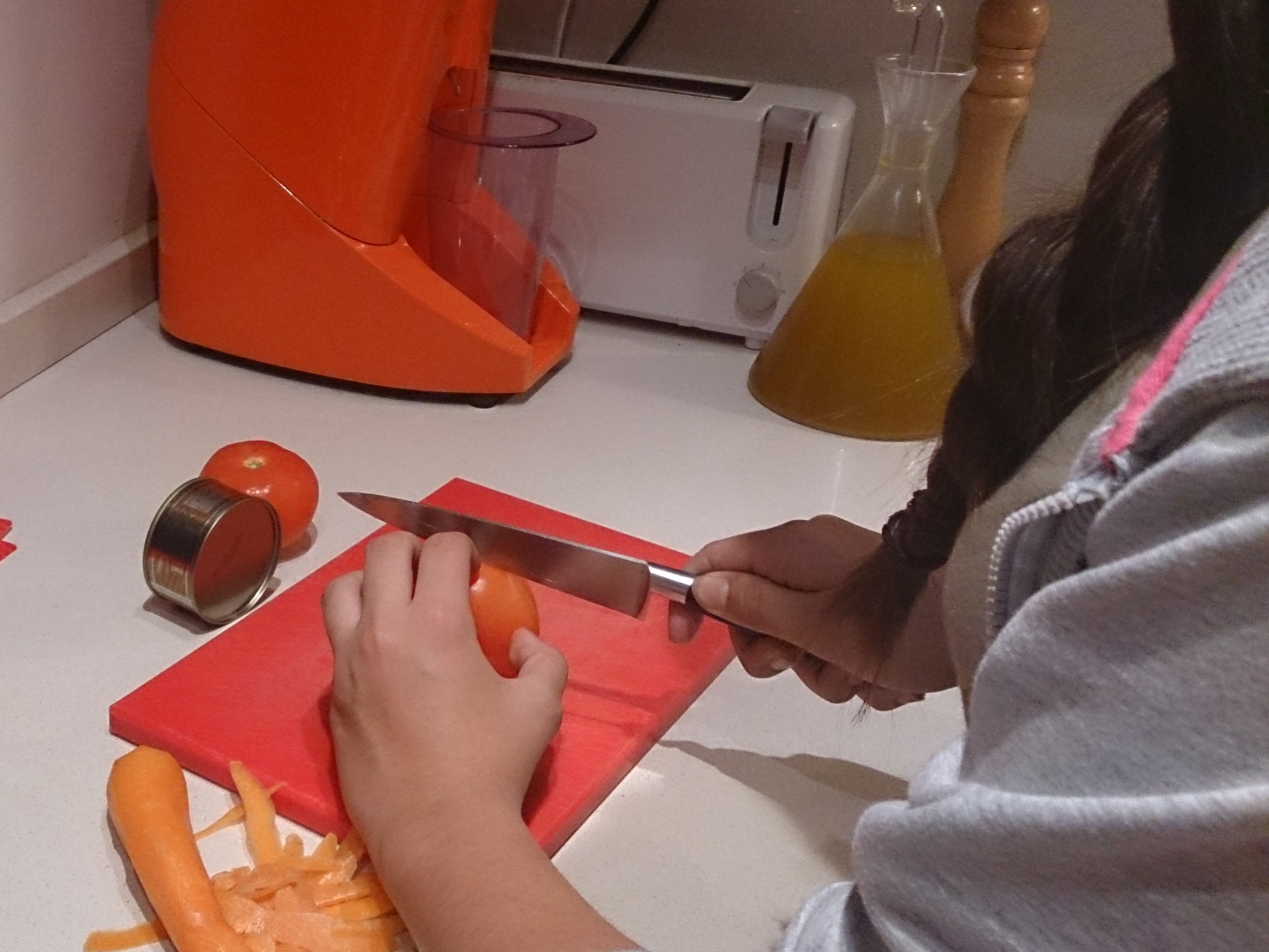 Tallem a trossos regulars els pebrots , la ceba i els tomàquets . Li afegirem la sal i l’oli d’oliva.
