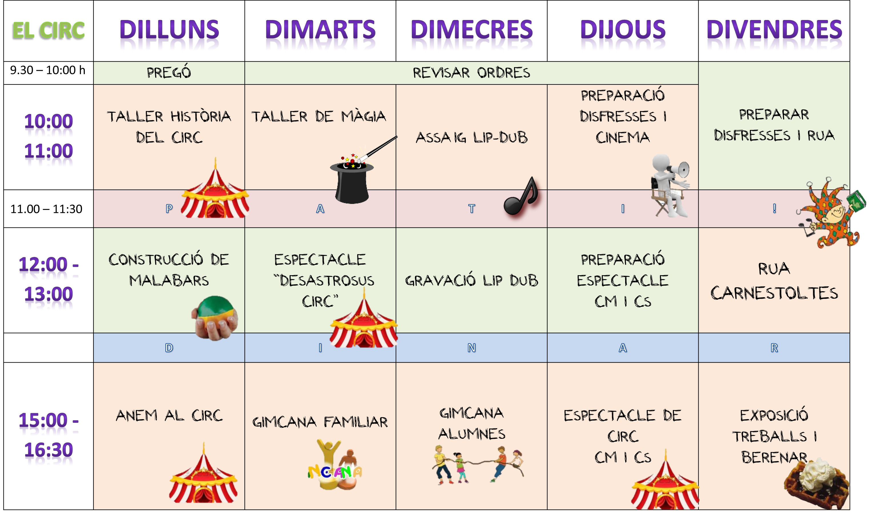 Durant la setmana vinent celebrarem a l’escola la Setmana Cultural. Aquest any dedicada al món del circ!!! Podeu veure què farem a la imatge de sota. Esteu tots i totes convidades a participar a la nostra Gimcana Familiar, al Pregó, a l’espectacle “Desastrosus Circ”, a la gravació del Lip-Dub, a la Rua de Carnestoltes…etc.