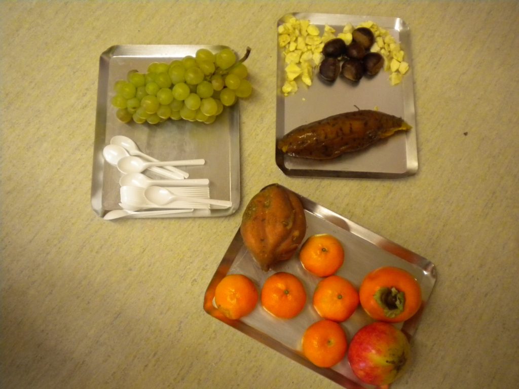 Aquesta setmana a experimentació hem tastat diferents fruits de la tardor: mandarines, raim, castanyes, moniatos, caquis i magranes. Hem vist com són per fora i per dins, els hem tocat, olorat i menjat. Però si voleu saber un secret…shhhh, ens consta una mica tastar coses noves, no ens agrada gaire!!!