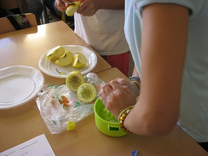 – una poma – una llimona – un ganivet – un exprimidor – dos plats – paper i llapis