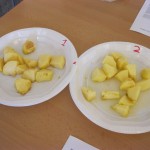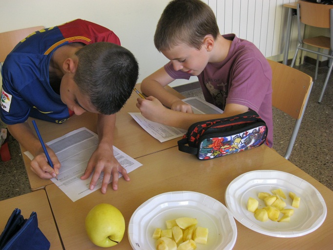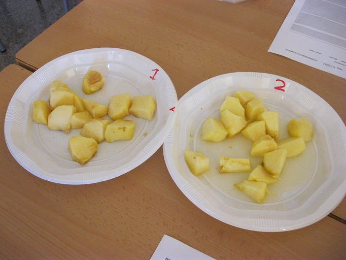 – Repartir els trossos de la poma pels dos plats