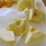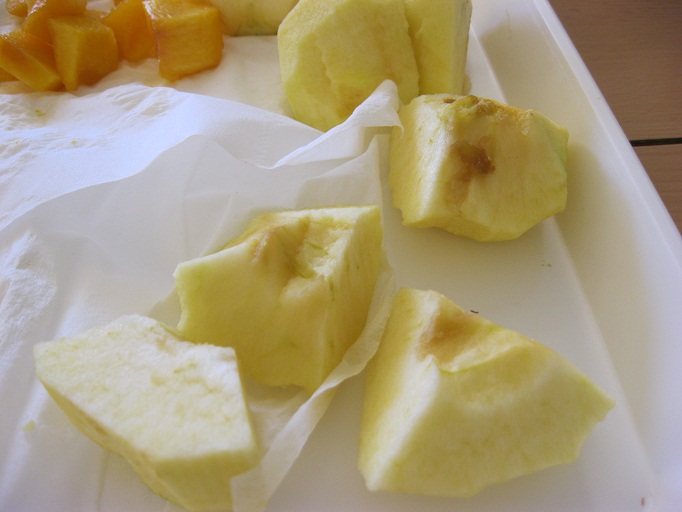– Pelar la poma i tallar-la en trossos més o menys iguals
