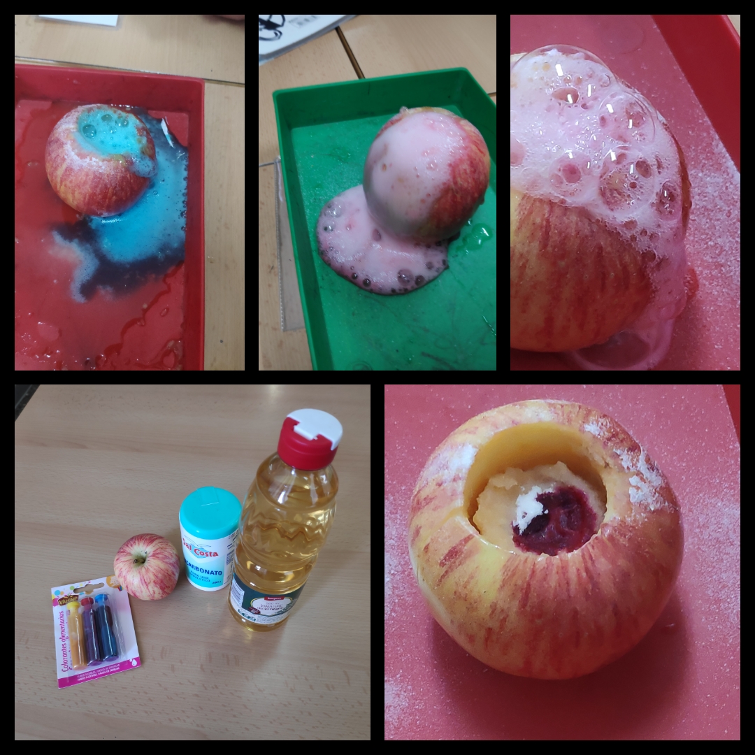 En aquesta poma li vam treure el cor i li vam posar bicarbonat sòdic, colorant i vinagre.