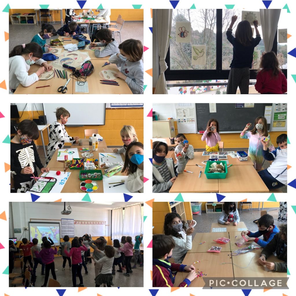 El divendres pel matí vam venir a l’escola en pijama i vam fer cinc racons creatius: pintar pedres, fer màscares, fer polseres, decorar les finestres i fer creacions amb pintura!