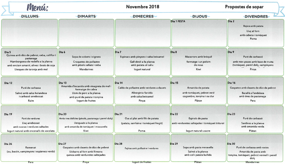Us adjuntem el menú del dinar facilitat per “Cuina Gestió” d’aquest mes i una proposta de sopar per casa. Bon profit!