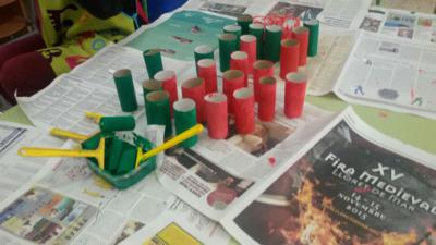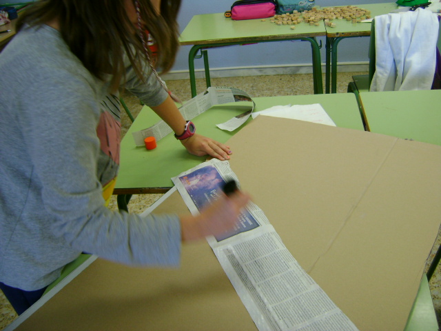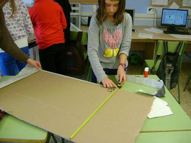 Objectiu: Construir un moble per organitzar millor els materials d’aula.Materials: 8 caixes de fruita de cartró, paper de diari, paper d’empaperar, cola, cinta mètrica, plafó de fusta i claus. |