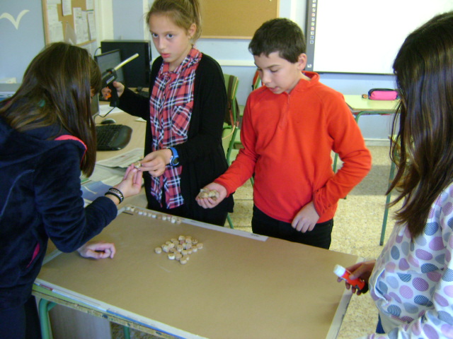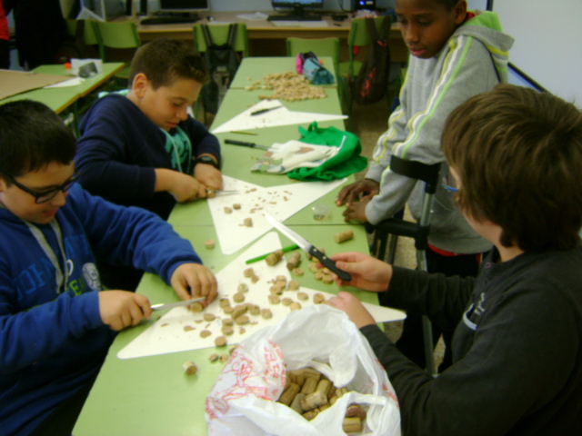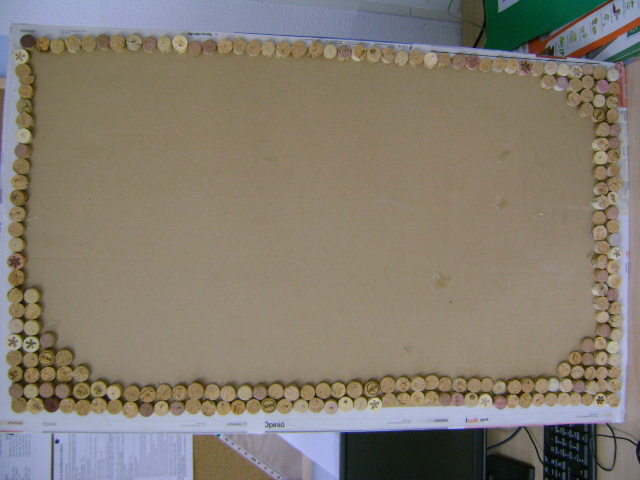 Procés: 1. Tallem taps de suro en cercles.2. Mesurem l’espai d’entre les finestres. 3. Tallem el cartró seguint les mides. 4. Fem un marc als cartrons amb diari. 5. Enganxem els cercles amb cola termofusible. 6. Ho col·loquem entre les finestres. |