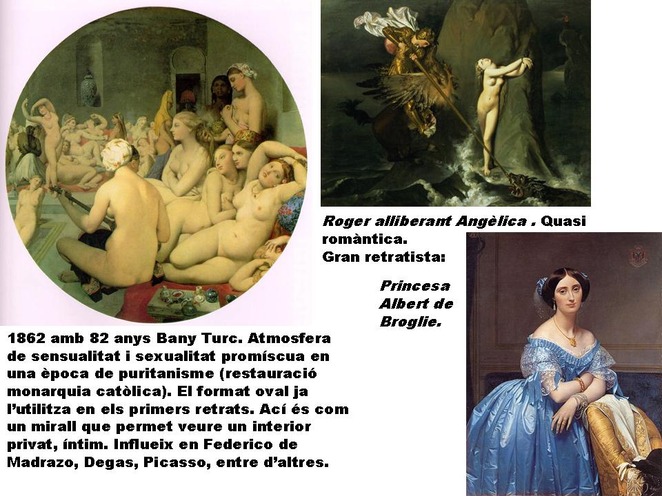 La gran odalisca, 1814. Ingres aspirava a la puresa dormal dels seus models. Cos desproporcionat expressament, ens recorda el manierisme renaixentista. Dibuix perfecte, propi de l’estil neoclàssic. |