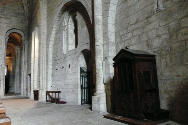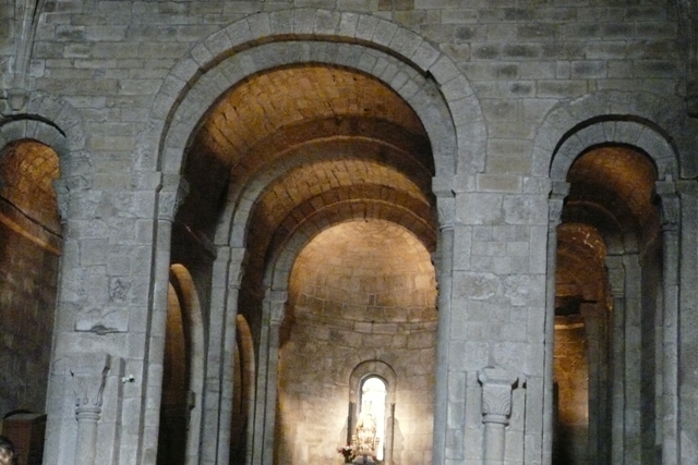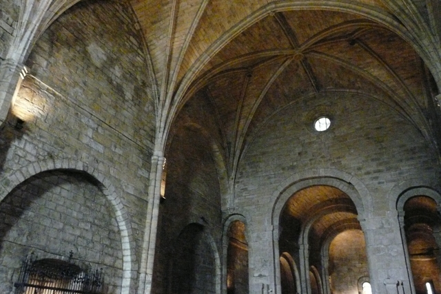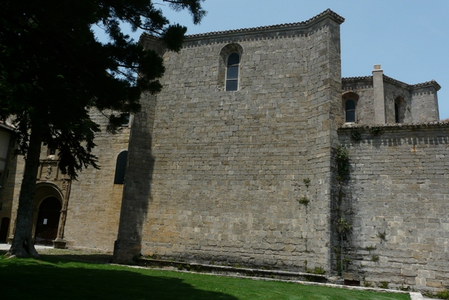 LA ESGLÉSIA: Combinació de construcció romànica dels s. XI-XII, que inclou la cripta, els absis coberts amb volta de canó, la torre, la nau principal i el pòrtic, conegut com a Porta Speciosa, i construcció gòtica posterior., la volta de creueria, suportada per contraforts i arcbotants exteriors, el panteó dels reis de Pamplona i una petita capilla, que data dels s. XIV i XV.