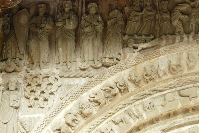- Las cuatro arquivoltas que se ubican sobre el tímpano están decoradas por representaciones de seres reales y fantásticos con motivos vegetales y animales en una armonía típica del románico.