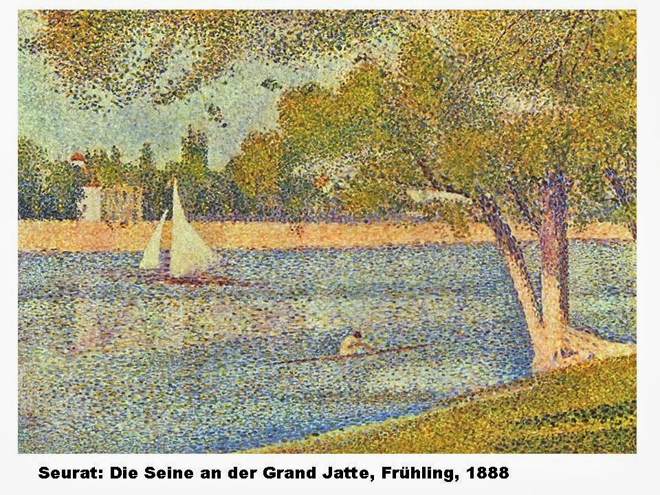 Seurat compartí les seves noves idees vers el PUNTILLISME amb Signac, qui posteriorment pintà amb la mateixa tècnica. L’estiu de 1884 Seurat començà la creació de la seva obra Tarda de diumenge en l’illa de la Grande Jatte. exposat al seu grup. Amb ell neix el terme PUNTILLISME, o tècnica de la barreja òptica dels punts. L’escola que creen s’anomena NEOIMPRESSIONISME O DIVISIONISME. Comparteixen l’interès dels impressionistes per la vida moderna i pel paisatge. Cerquen la llum i el color, però van més enllà en voler aplicar sistemàticament les lleis científiques del color formulades per Chevreul i altres. Els neoimpressionistes calculen més la combinació de línies, tons i colors per expressar el que es vol amb la màxima harmonia.