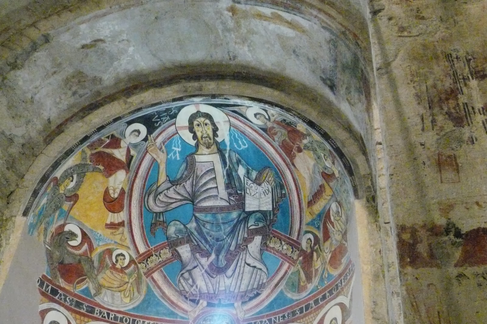 A la zona mitjana de l’absis hi ha representats els Apòstols sota una arcuació. Tots portaven escrit el seu nom, encara que alguns s’han perdut. La part de baix està pintada amb una sèrie de medallons enllaçats amb decoració vegetal, en els quals apareixen les imatges d’alguns animals (àguila, cigonya, lleó, drac i peix), i encara més avall hi ha un fris de pintures que reprodueixen cortinatges, molt ben elaborats. En el doble arc presbiteral que precedeix l’absis es veu l’Agnus Dei, més estrelles i una escena d’Abel vestit de pastor. Es creu que a l’altre costat hi podia haver la figura de Melquisedec.