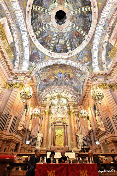 Pintura al fresc. Temàtica: “Les pintures són una evocació de les dones del Antic Testament que podien ésser prefiguratives de la Verge Maria. La figura de la dona i dels diferents fets bíblics en les seves cites corresponents adornen la cúpula central dividida en vuit parts, Dèbora, Judhit [3], Rebeca, Abigail, Jael, Maria, Raquel i Ester, presideixen aquest important espai central. Col·locades sobre les petxines que suporten la volta central i la llanterna, estan els profetes que van anunciar la Maternitat virginal, Moisès, Isaïes, Jeremies i Ezequiel.