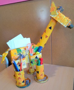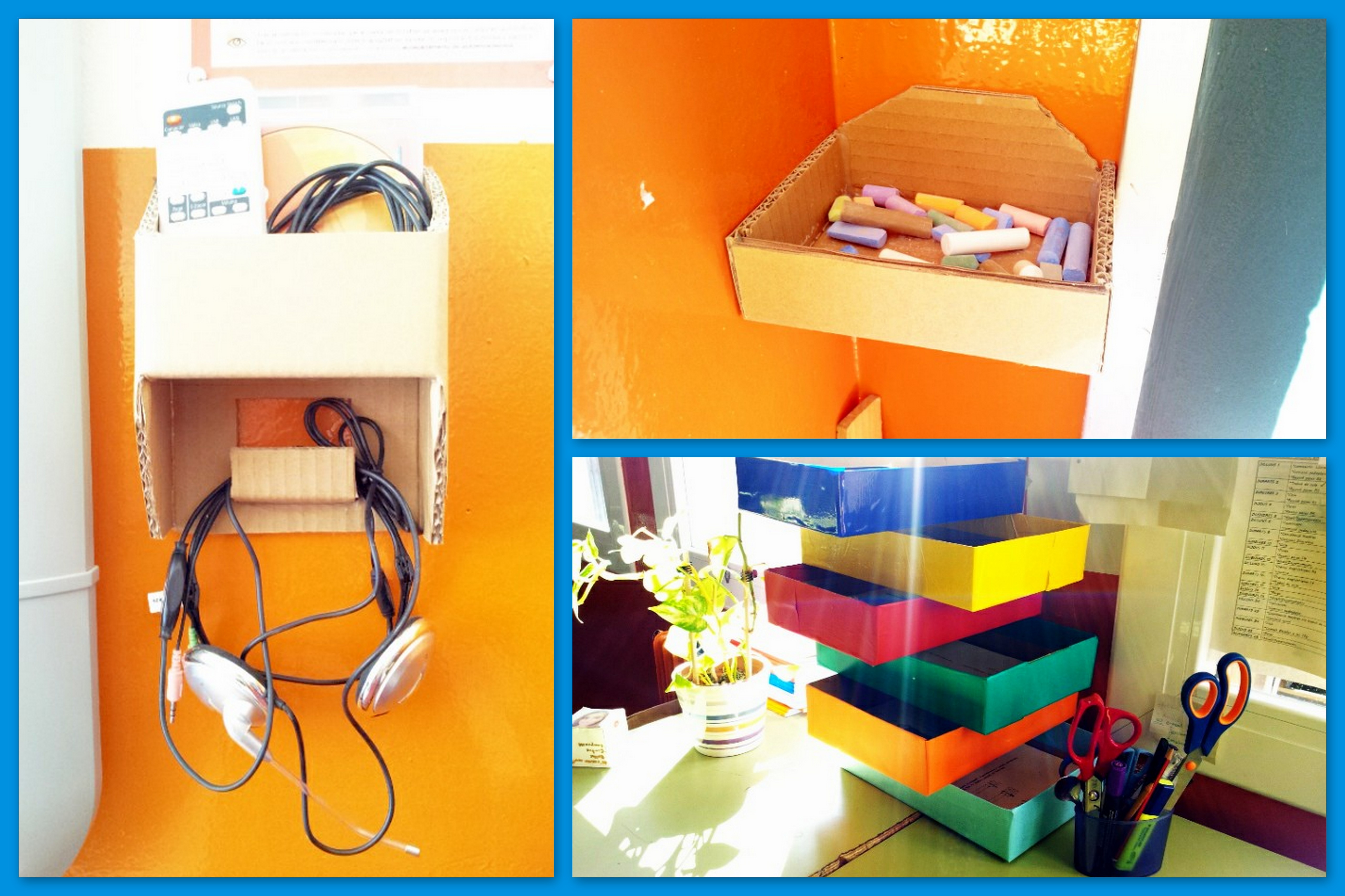 – Moblet de sobretaula per tenir a mà les fotocòpies del dia a dia! Segur que si sou mestres ja heu endevinat d’on he tret les safates! Simplement són les tapes de les caixes dels paquets de fulls. Ja sé que no és cap novetat però folrradades de colors i apilades amb gràcia fan patxoca, no?