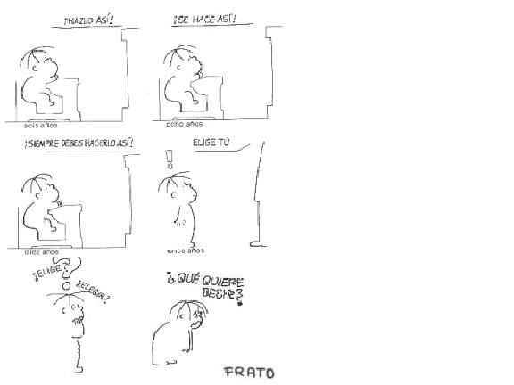 Ens trobem de nou en un moment de canvis importants dins en el sistema educatiu, ressonen de nou pedagogs com F. Tonucci, famós pedagog que per mitjà de l’art ens explica la seva visió del que significa educar, fomentant l’autoestima i la motivació personal. Aquest sostenia ja per aquells temps, la idea de que l’infant havia de prendre tot el protagonisme en el procés d’ensenyament-aprenentatge, en el que a més s’havia de potenciar la seva autonomia i la seva creativitat, tot donant molta importància al respecte de les capacitats individuals dels nens/es…