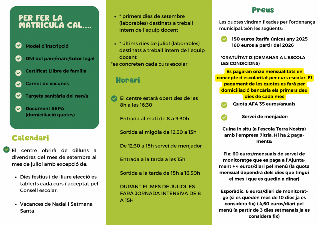 Primer de tot, el tríptic informatiu amb les diferents informacions bàsiques del funcionament de l’escola!