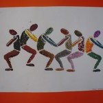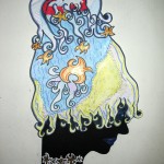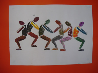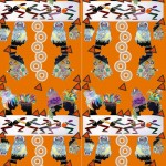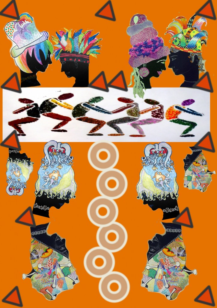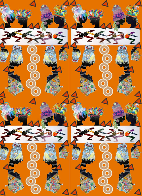 Aquest exemple parteix d’un treball previ mitjançant el dibuixos fets sobre paper, amb colors, pintures i collage. En aquest cas es tractava d’utilitzar creacions sobre paper fetes amb textures visuals i amb estarcit, combinant caps i cossos. Després d’escanejar els dibuixos, s’han modificat i repetit amb l’ordinador tot construint una xarxa.