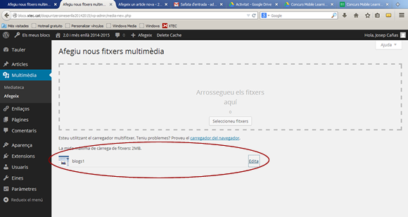 Al servidor cada blog disposa d’un espai total de 70Mb, és per aquesta qüestió que cal tenir cura de no pujar fitxers massa voluminosos, ja que si no posem atenció, l’espai assignat pot esgotar-se ràpidament.