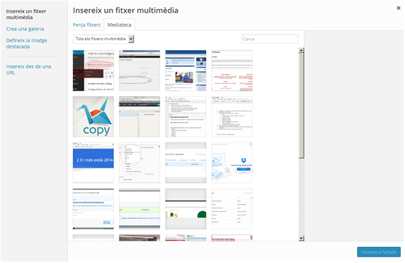 -L’opció Mediateca ens mostra totes les imatges que tenim pujades al blog. Procediu de la mateixa manera que amb la Galeria per inserir una imatge a l’article des d’aquesta opció.