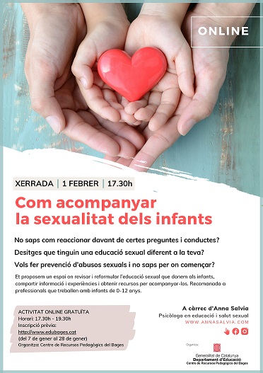 El dia 1 de febrer a les 17:30h i en format online l’Anna Salvia oferirà una xerrada adreçada als docents sobre com acompanyar la sexualitat dels infants.