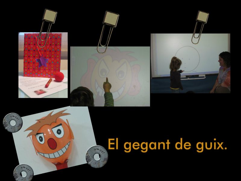 El personatge també em serveix com a fil conductor d’alguna proposta que vull fer amb ells. Un dia ens va deixar una bossa de regal en la que hi havia un globus taronja, unes peces de cartolina (ulls, boca, nas…), una barra de maquillatge vermella, el seu nas i una carta. En ella deia que s’havia anat d’excursió al circ però que ens havia deixat unes pistes per l’escola (uns globus inflats) que ens portarien a una pissarra màgica.