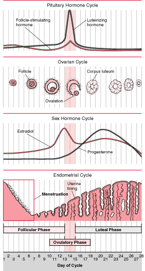 – durant la fase preovulatòria o fol·licular la hipòfisi actua (mitjançant la FSH i la LH) sobre els ovaris induint a les cèl·lules fol·liculars de l’oòcit a secretar estrògens (estradiol) i en la fase mitjana a retenir i acumular LH fins a 12 hores aproximades del moment de l’ovulació, que es produeix gràcies a l’alliberament sobtat de LH.
