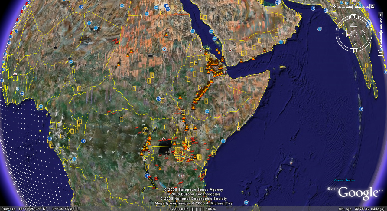 En aquesta imatge del google earth es pot veure la munió de volcans que delimiten el rift-valley africà.