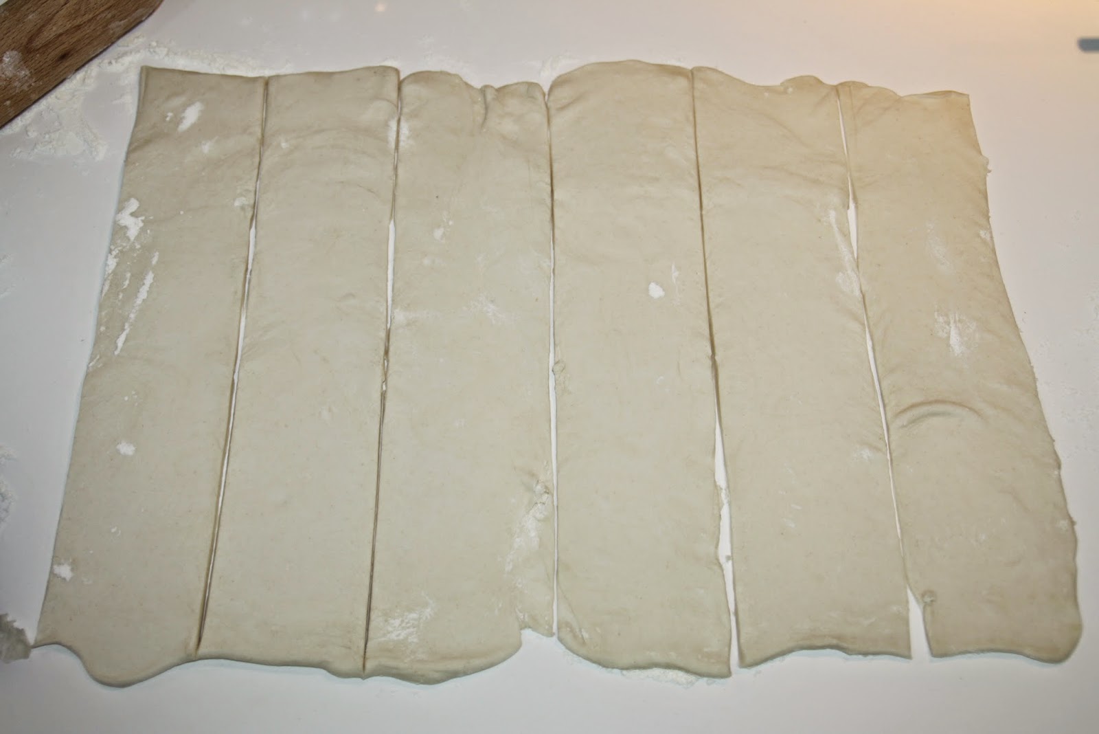 A cada tira, hi escampem una mica de melmelada i hi espolsem sucre moreno.