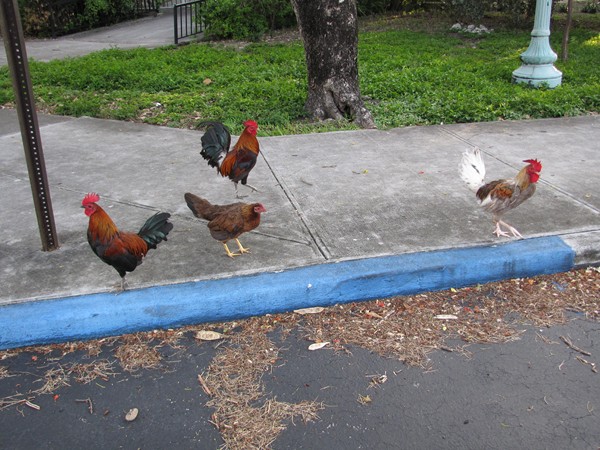 El primer que sorprèn de Cayo Hueso és la presència de galls (gallines i polls) lliures per tota l’illa, tan respectats que són capaços d’aturar el trànsit perquè estan travessant o menjant al mig del carrer.