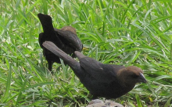 També menjant llavors per terra hi vam trobar un grup d’ocells foscos i de bec gruixut, Molothrus ater. L’exemplar de la fotografia és un mascle, la femella és de color marró més homogeni. Es tracta d’un ocell que parasita els nius d’altres espècies posant-hi els seus ous, tal com ho fa el cucut a casa nostra.
