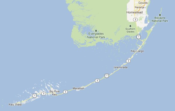 Els Cayos de Florida formen la prolongació natural que parteix del sud de la península homònima formant un arc que s’acosta fins a només 151 Km de Cuba, des de Cayo Hueso (o Key West) la darrera illa habitada d’aquest conjunt. Aquesta proximitat que ja hem notat amb la gent que pobla Miami, aquí es fa més patent a través del paisatge. La cultura nord-americana avesada a moure’s per tot arreu amb el seu cotxe particular, ha unit aquest rosari d’illots a través d’una carretera que facilita el turisme massiu.