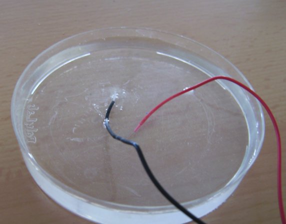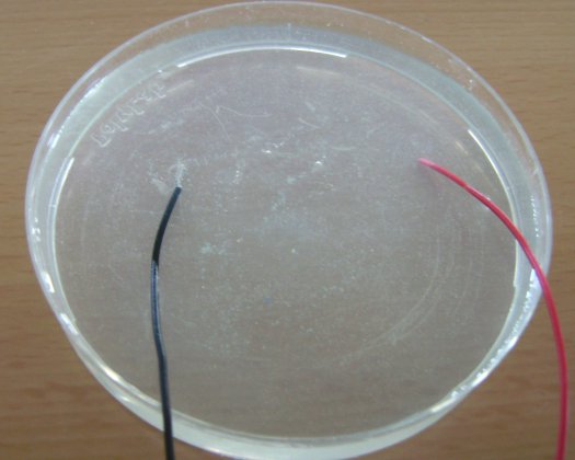 Vam posar aigua destil·lada en un pot i una mica de sal marina amb antiaglomerant (ferrocianuro potàssic), l’hem remenat fins que la sal s’ha dissolt. Hem posat una mica de la dissolució en una càpsula de petri.A part teníem dos cables connectats a un generador de 6V. Els dos cales són de coure.Quan hem posat els cables a l’aigua destil·lada barrejada amb sal, pel cable negatiu surten bombolles. Quan ajuntem els cables no fa bombolles.Després de 21’ 50’’ l’aigua ha canviat de color, ara és blavosa, el coure del cable positiu s’ha desfet i el coure del cable positiu s’ha tornat de color negre i han deixat de sortir bombolles.