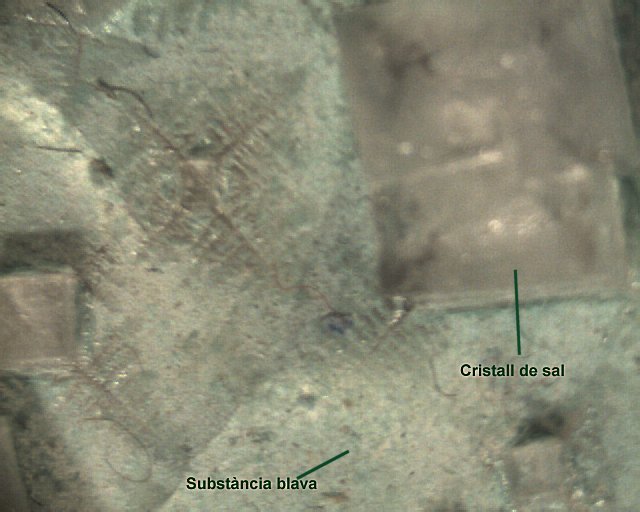 ” La substància blava surt del cable vermell ( positiu) i hi ha trocets de cable a la solució. Els cables s’han escalfat. Al juntar els dos cables a l’aigua fa soroll. La reacció de l’aigua salada amb l’electricitat i amb el coures provoca , gràcies a l’oxigen de l’aigua, l’oxid de coure. Creiem que les bombolles es formen perque l’hidrògen queda sense l’oxigen i s’envà a l’altre costat per sortir en forma de bombolles.” (Adry, Marc G)