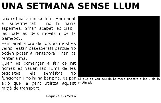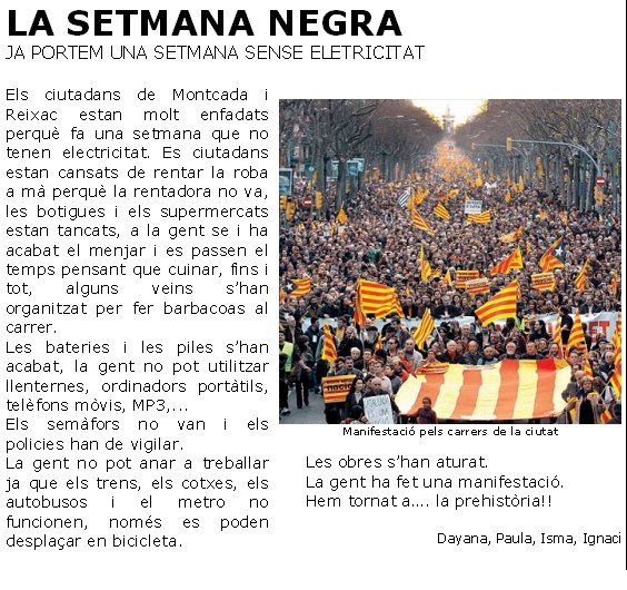 “Pel mati ens despertem i pugem les persianes perquè entri la llum del sol, així podem esmorzar tranquil·lament, només podríem esmorzar coses fredes, però si que podrien fer-se la llet calenta la gent que té gas natural a la cuina. A las cases que tenen gas natural es poden dutxar quan vulguin. Per anar a l’escola hem d’anar caminant o amb bicicleta, perquè el motor de la benzinera no funciona, el sortidor, i els semàfors estan desconnectats i molta gent no pot anar a treballar perquè els trens i els metros no funcionen. Nosaltres a la escola hem d’obrir totes les persianes perquè entri la llum, no podem fer algunes assignatures com informàtica perquè els ordinadors no funcionen i algunes coses de laboratori que necessitem l’ordinador. Aquí, a l’escola, la cuina es de gas natural i hem dinat molt bé. No podem fer la majoria extraescolars perquè no hi ha llum. Desprès per la nit hem d’encendre espelmes per poder veure a casa, i ens entretenim jugant a les consoles que tenen la bateria carregada, l’ordinador portàtil i amb jocs de taula. I desprès ens anem a dormir.”i durant una setmana?