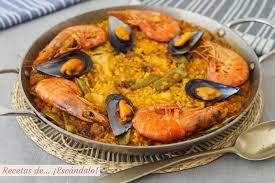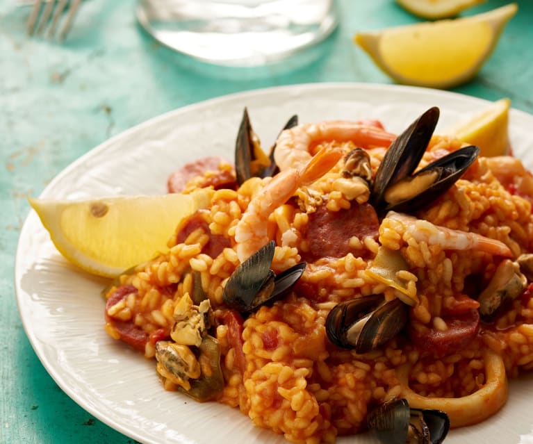 Zuerst man schneit die Paprika und hackt die Zwiebel. Dann fügt man den Reis, die Paprika und die Erbsen. Man schneit die Hähnchenbrust und mit den Meeresfrüchten auf der Mischung verteilt. Jetzt wirft man die Brühe. Die Paella ist in etwa 35 Minuten fertig.