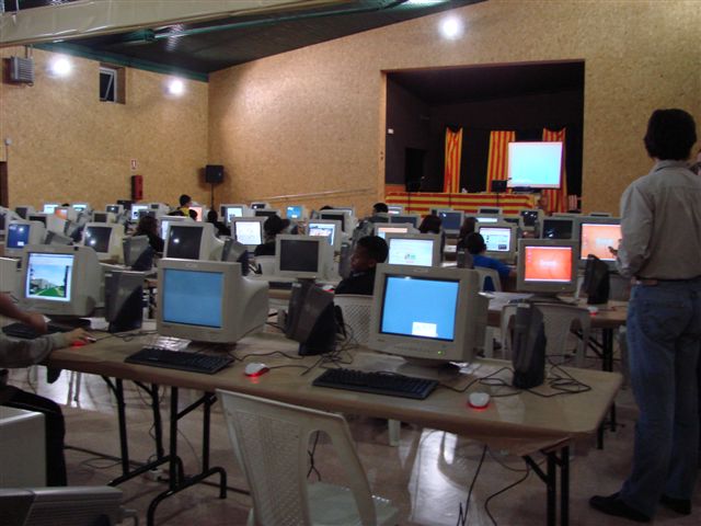 Em va encantar veure la sala del Terra Roja, amb els 100 ordinadors connectats utilitzant la Linkat. De fet, els ordinadors que “treballen” són cinc servidors; i amb “terminals” de Sun Microsystems i monitors trobats aquí i allà, vaig provar de treballar amb diversos programes amb un bon resultat. En diuen “thin clients” o terminals, i crec que poden ser una alternativa a la continuada obsolència dels equipaments informàtics de les aules d’informàtica. Potser estaria bé no llençar ordinadors ni pantalles, i investigar en aquesta línia.