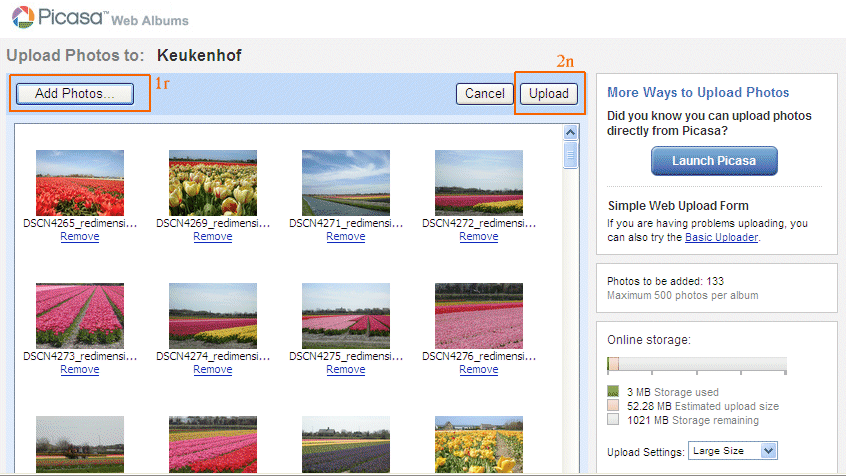 Com s’explica a l’article anterior, amb el navegador internet explorer, un cop s’accedeix al servei d’àlbums web et dona l’opció d’instal·lar un software que possiblita pujar totes les fotos de cop. En cas contrari, o bé es treballa amb el programa Picasa (si ja està instal·lat a l’ordinador), o bé s’han de pujar les fotos una a una.